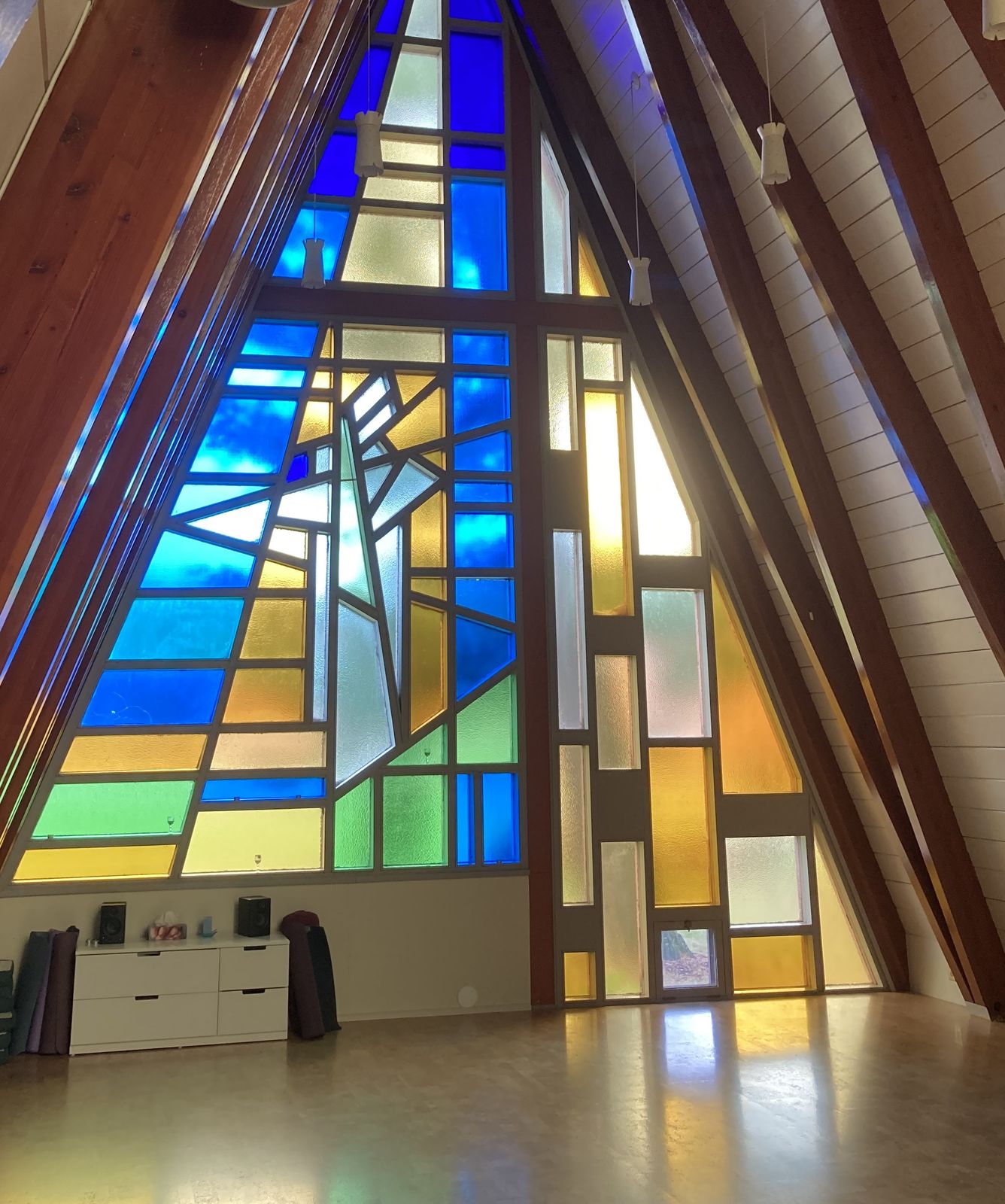 To this day, the studio incorporates most of the original architecture of the chapel. The abstract stained glass windows are the most noticeable feature, inviting light and colour into the space. The stone wall opposite is of a particular style common to the era the chapel was built and features local rock. The wooden beams that reach to the peak are striking. The large crosses indicate where the altar once stood and other small details can be found. These elements acknowledge the history of the space.